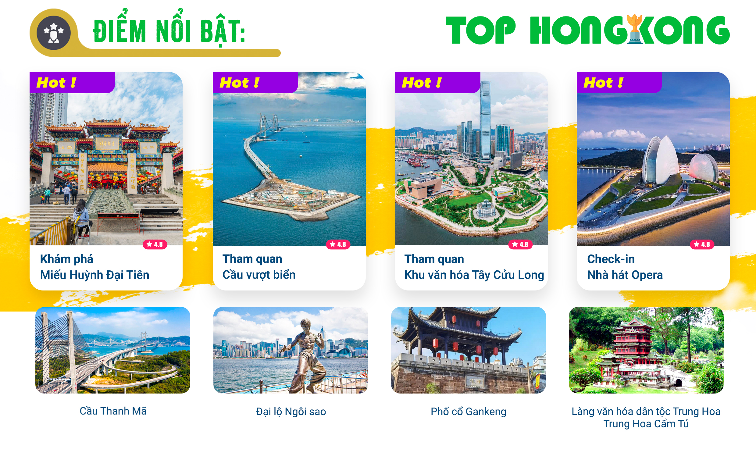 - Đoàn khám phá Đại lộ Ngôi sao có chiều dài gần nửa km gắn 100 ngôi sao in dấu vân tay, chữ ký của các nhân vật nổi tiếng Hồng Kông. Di Sản 1881 nằm ở con đường nổi tiếng của Đường Canton, Tsim Sha Tsui Hong Kong trụ sở Cảnh sát biển trước đây, có lịch sử hơn 130 năm, tái định hình các tác phẩm kinh điển và tích hợp các thiết kế cũ và mới để trở thành một du lịch văn hóa và mua sắm giải trí ở Hồng Kông.