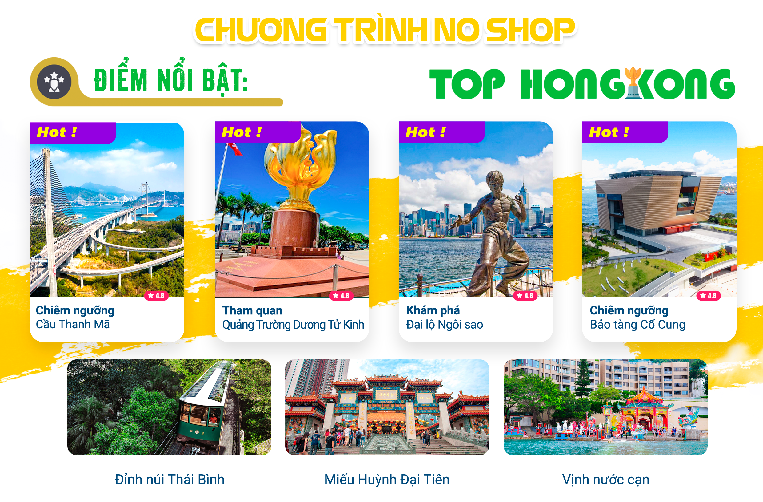 - Sau khi ăn sáng, Quý khách làm thủ tục trả phòng. Xe đưa đoàn viếng thăm “Chùa Wong Tai Sin” (Miếu Huỳnh Đại Tiên) – ngôi chùa nổi tiếng linh thiêng của người dân Hồng Kông. Không chỉ ở Hồng Kông mà ngay cả những người ở Trung Quốc đại lục cũng thường xuyên sang đây để cúng bái. Được xây dựng từ năm 1921 theo truyền thuyết là một vị hòa thượng tên là “Wong Tai Sin” đã tu hành chính quả nơi đây và từ đó lấy tên của ông đặt cho ngôi miếu này.