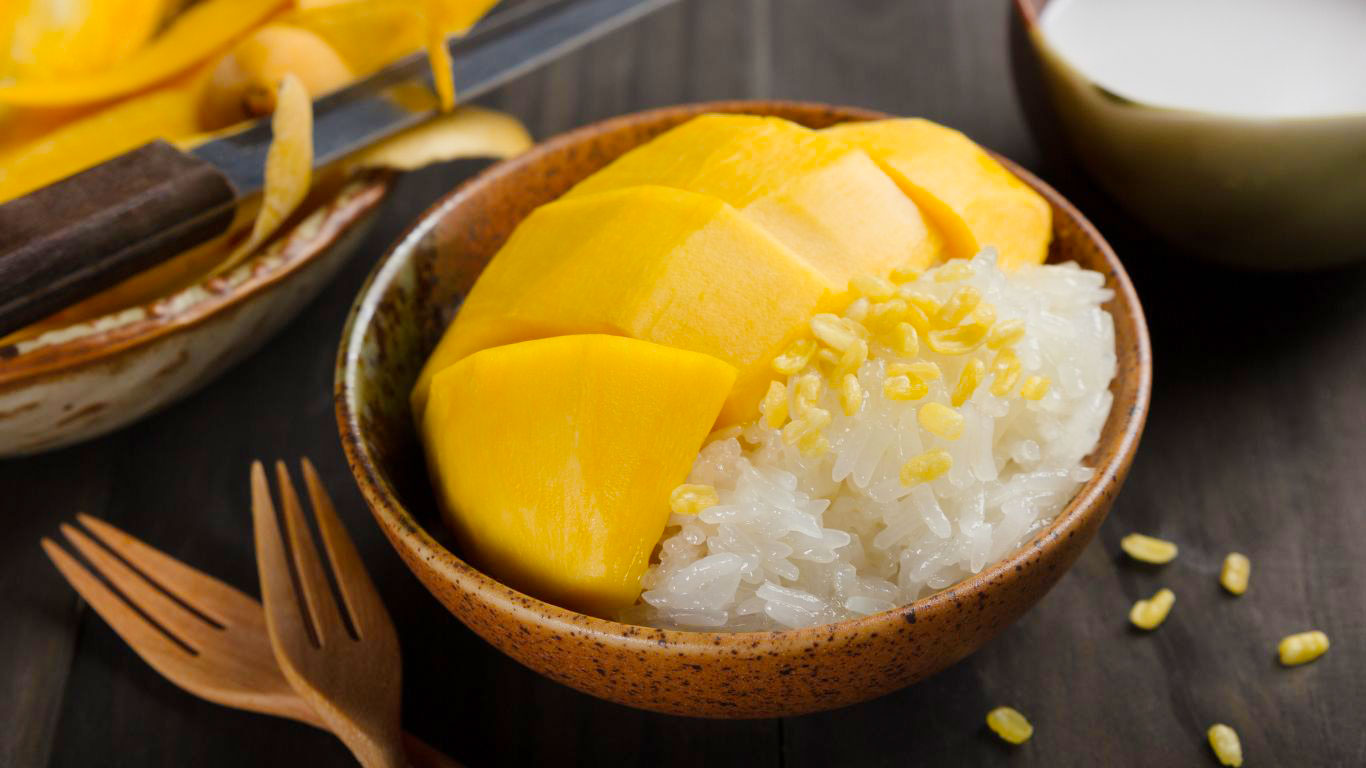 Xôi xoài (Khao Niew Ma Muang): sự kết hợp hoàn hảo giữa xôi nếp dẻo, xoài chín vàng và nước cốt dừa béo ngậy.