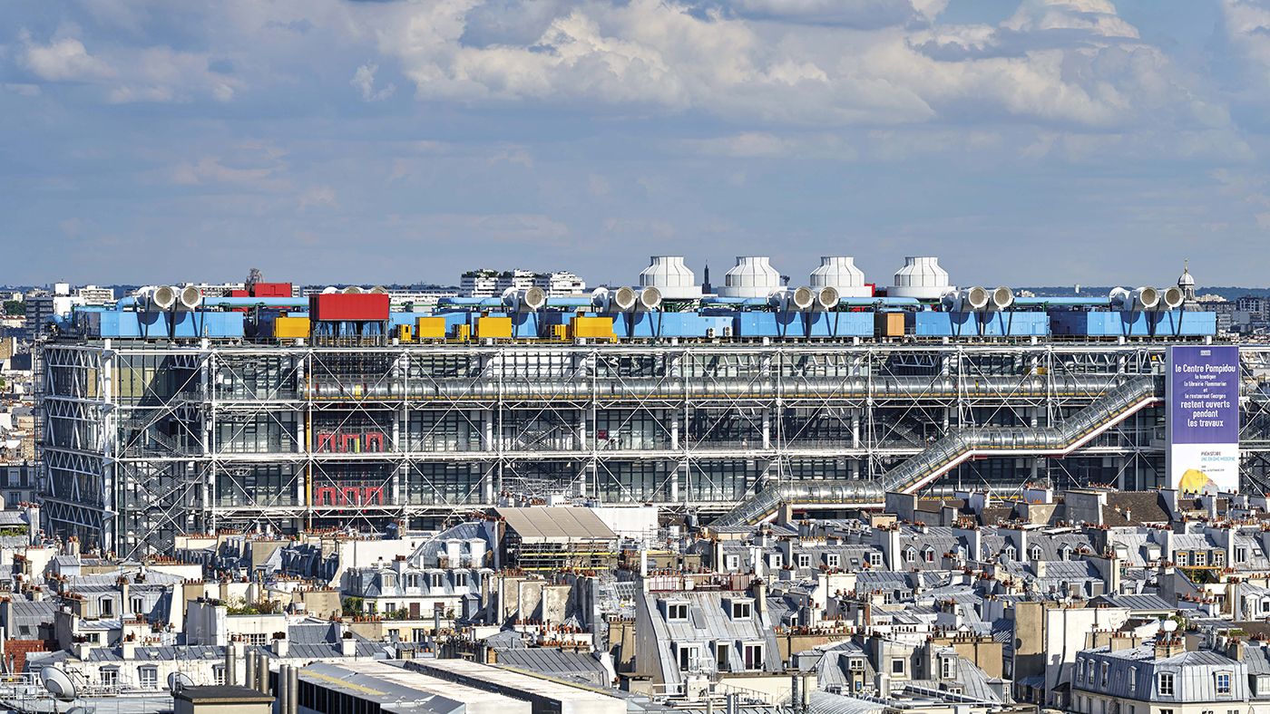 Centre Pompidou tọa lạc tại quận 4 Paris, gần khu phố lịch sử Le Marais và bờ sông Seine. Trung tâm được khánh thành vào năm 1977, là dự án do kiến trúc sư Renzo Piano, Richard Rogers và Gianfranco Franchini thực hiện. Kiến trúc của Pompidou nổi bật với các ống dẫn cơ điện, thang cuốn và cấu trúc khung thép được bố trí bên ngoài tòa nhà, tạo nên diện mạo hiện đại, khác biệt so với các công trình cổ điển xung quanh.