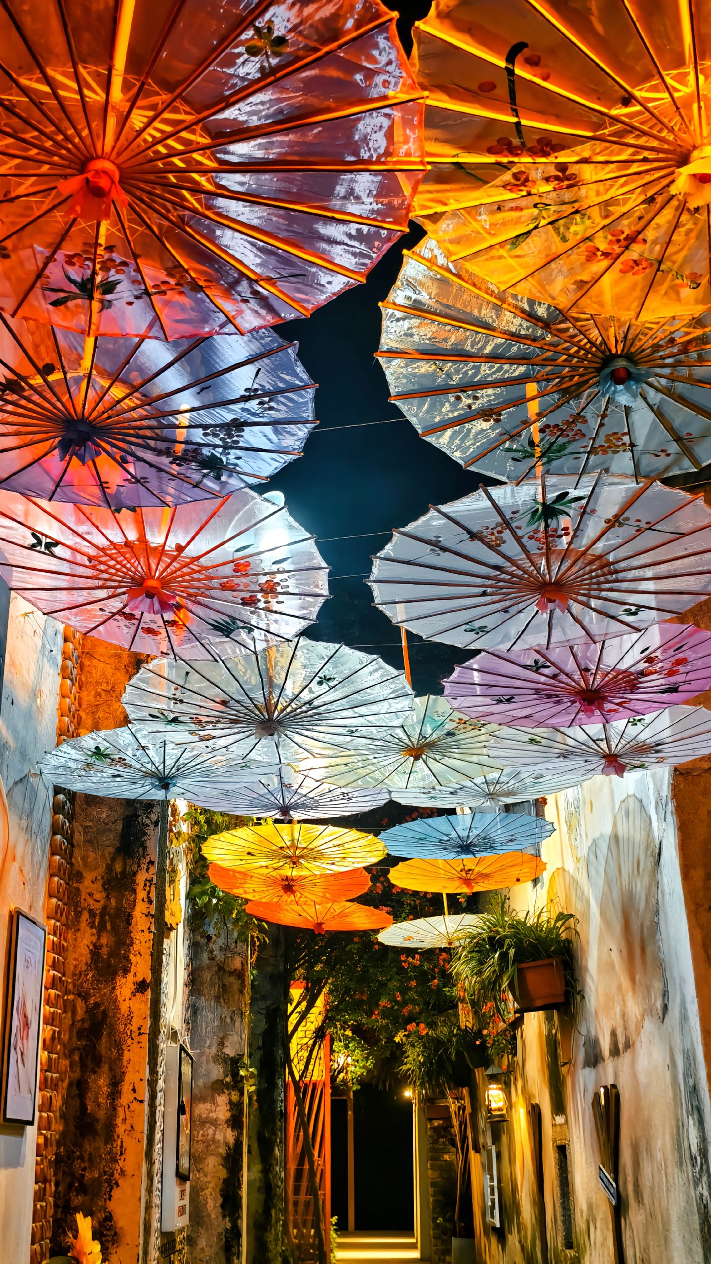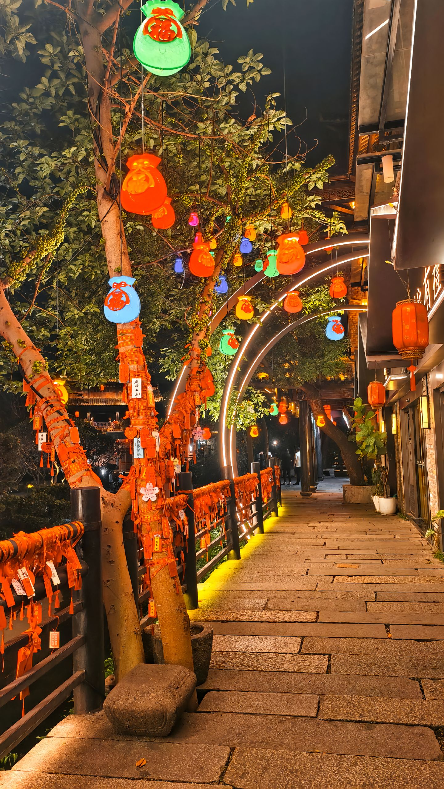 Từng góc nhỏ đều mang màu sắc hoài cổ: những dãy nhà gạch xám, cửa gỗ đỏ, mái cong đen bóng và đèn lồng treo cao. Khi chiều buông, ánh nắng vàng len qua từng kẽ mái, tạo nên khung cảnh như tranh.