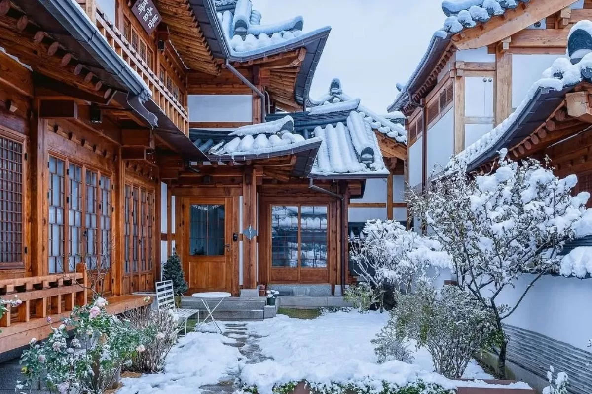 Chỉ cách cung điện vài phút đi bộ, làng cổ Bukchon Hanok là nơi lưu giữ hàng trăm ngôi nhà truyền thống có tuổi đời hàng trăm năm. Vào mùa đông, tuyết phủ lên mái ngói đen và con hẻm nhỏ, tạo nên khung cảnh vừa cổ kính vừa nên thơ. Đây là điểm check-in yêu thích của du khách quốc tế khi đến Seoul.