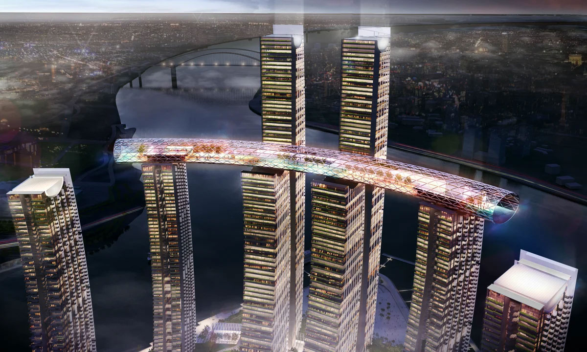 Nằm ở nơi hai con sông gặp nhau, Raffles City Chongqing là biểu tượng hiện đại nhất của thành phố. Công trình này gây ấn tượng mạnh với kiến trúc “Con tàu trên trời” – một tòa nhà ngang nối liền 8 tòa tháp chọc trời, cao hơn 350m.