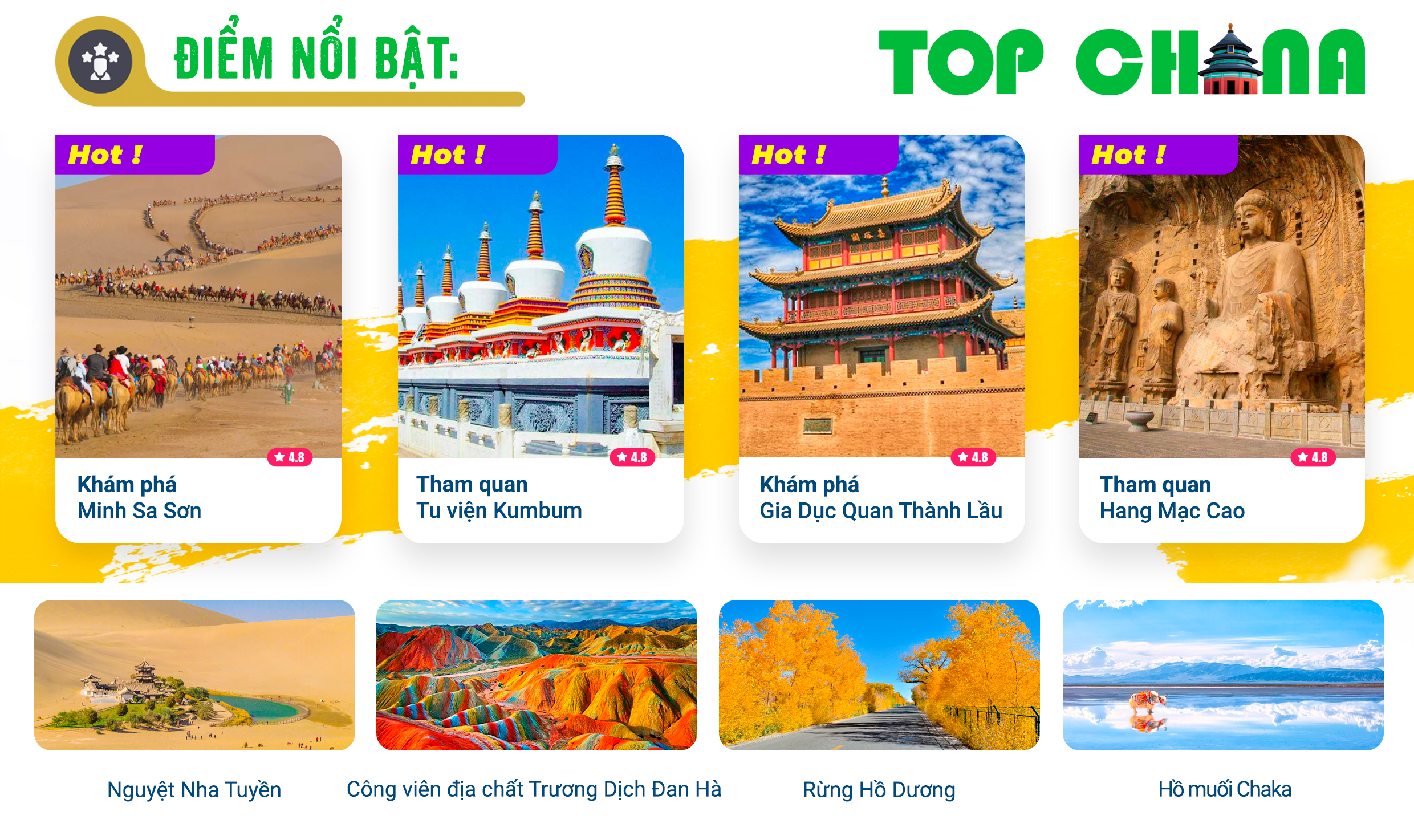 - Hang Mạc Cao (Hang nghìn Phật) là quần thể hang động Phật giáo nổi tiếng, nằm bên rìa sa mạc Gobi. Được UNESCO công nhận là Di sản văn hóa thế giới kho báu nghệ thuật Phật giáo lớn nhất thế giới, phản ánh sự giao thoa văn hóa rực rỡ trên Con đường Tơ Lụa cổ (Bao gồm xe điện).