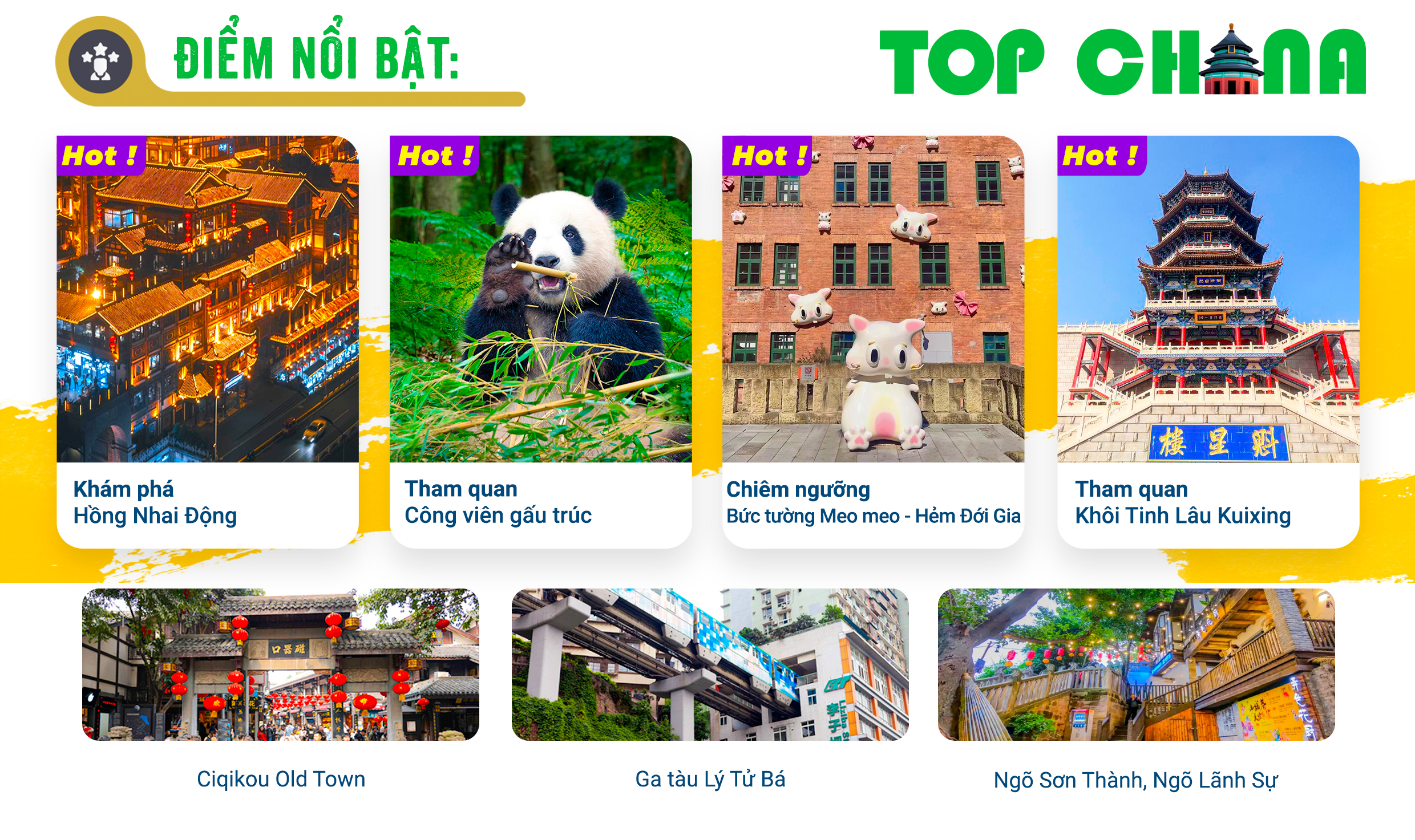 - Hẻm Đới Gia được xây dựng từ năm 1371 với đại đa số người nhà họ Đới sinh sống đã hình thành nên tên của con phố này. Ngoài ra, du khách check-in tại bức tường Meo Meo với hình thù những chú mèo ngộ nghĩnh. Quý khách dùng bữa tối tự túc, tự do khám phá và thưởng thức ẩm thực địa phương Trùng Khánh hoặc đăng ký các option tour dùng bữa tối:
