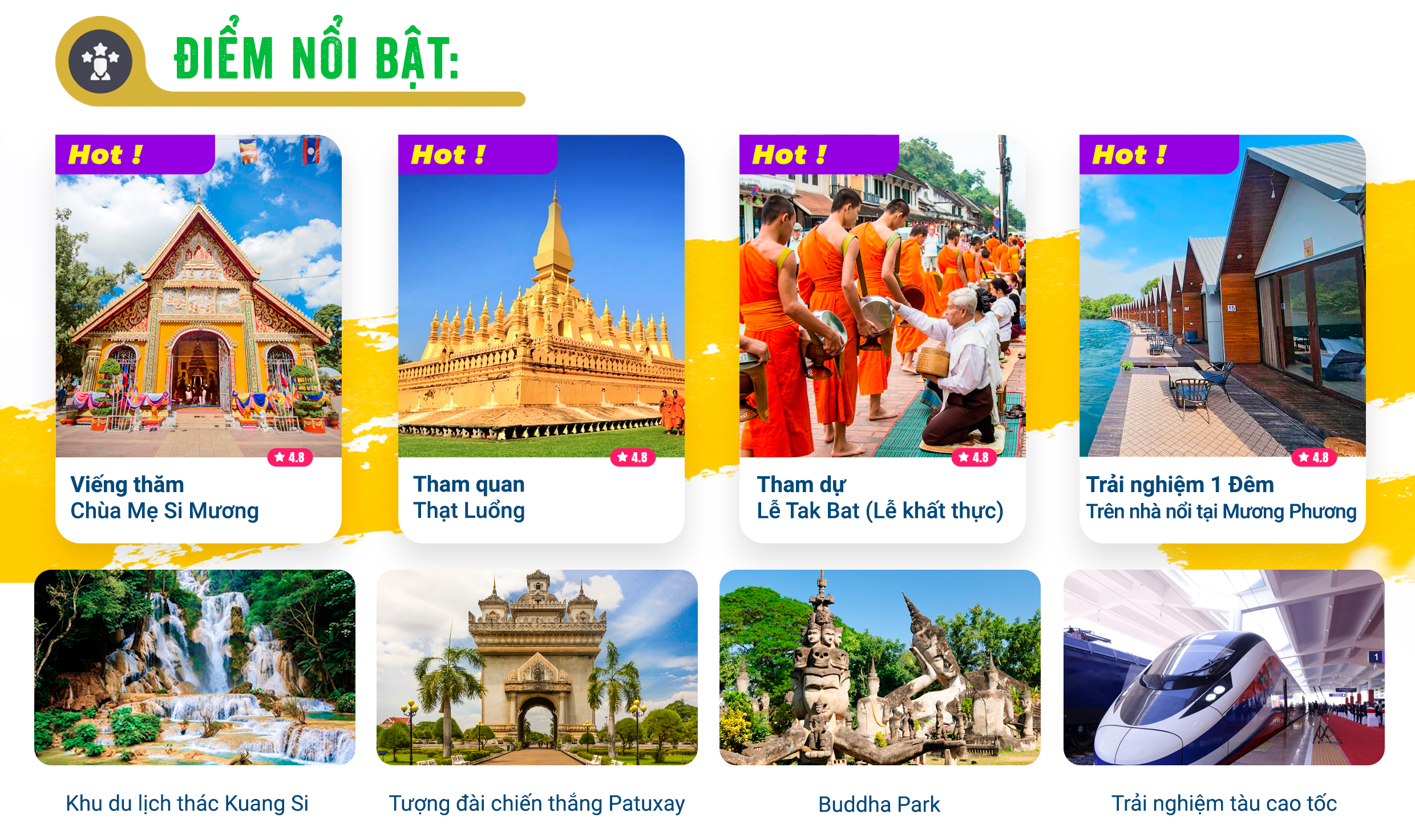 - Tháp Thạt Luổng – Một trong những công trình kiến trúc mang màu sắc đặc trưng nhất, mang tính tôn giáo sâu sắc. Biểu tượng cho trí tuệ, óc sáng tạo và tinh thần đoàn kết của người dân Lào.