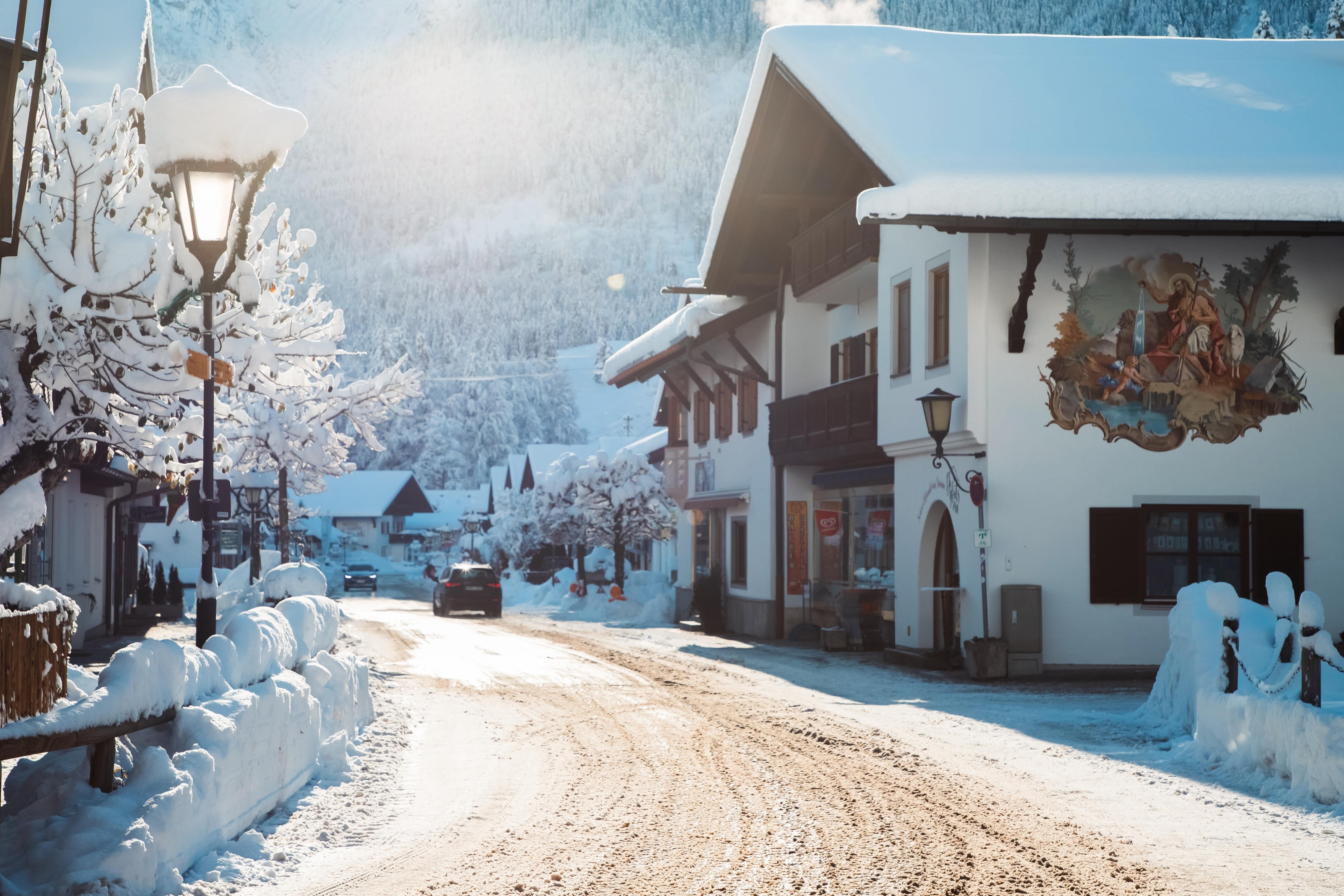 Garmisch-Partenkirchen là ngôi làng miền núi ở Đức nổi tiếng với những ngôi nhà gỗ truyền thống vẽ tranh trên tường, những quán bia cổ và cảnh quan núi Zugspitze phủ tuyết ấn tượng. Mùa đông tại đây mang vẻ đẹp đậm chất Đức với rừng thông xanh thẫm, con đường cổ kính và bầu không khí yên bình.