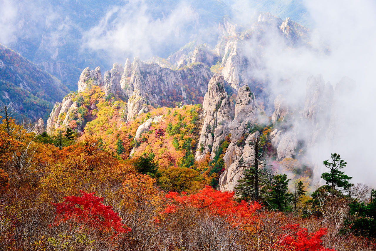 Seoraksan được xem là một trong những ngọn núi đẹp nhất Hàn Quốc, đặc biệt khi thu sang. Những cánh rừng phong trải dài, điểm xuyết giữa vách đá hùng vĩ, tạo nên bức tranh thiên nhiên vừa hùng tráng vừa lãng mạn. Đây cũng là nơi lý tưởng để trekking ngắm cảnh.