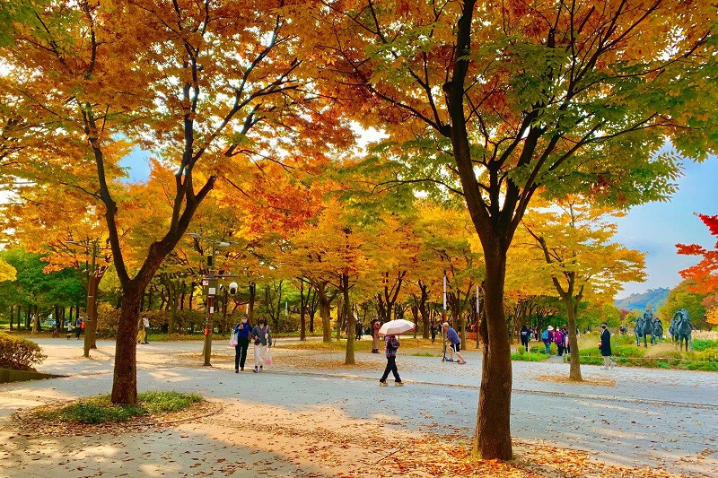 Nếu muốn tránh xa sự ồn ào, hãy đến Seoul Forest. Mùa thu ở đây yên tĩnh, thoáng đãng, với những con đường rợp lá vàng, bãi cỏ xanh và hồ nước phẳng lặng. Đây là điểm picnic, tản bộ và chụp ảnh cực “chill” cho giới trẻ.