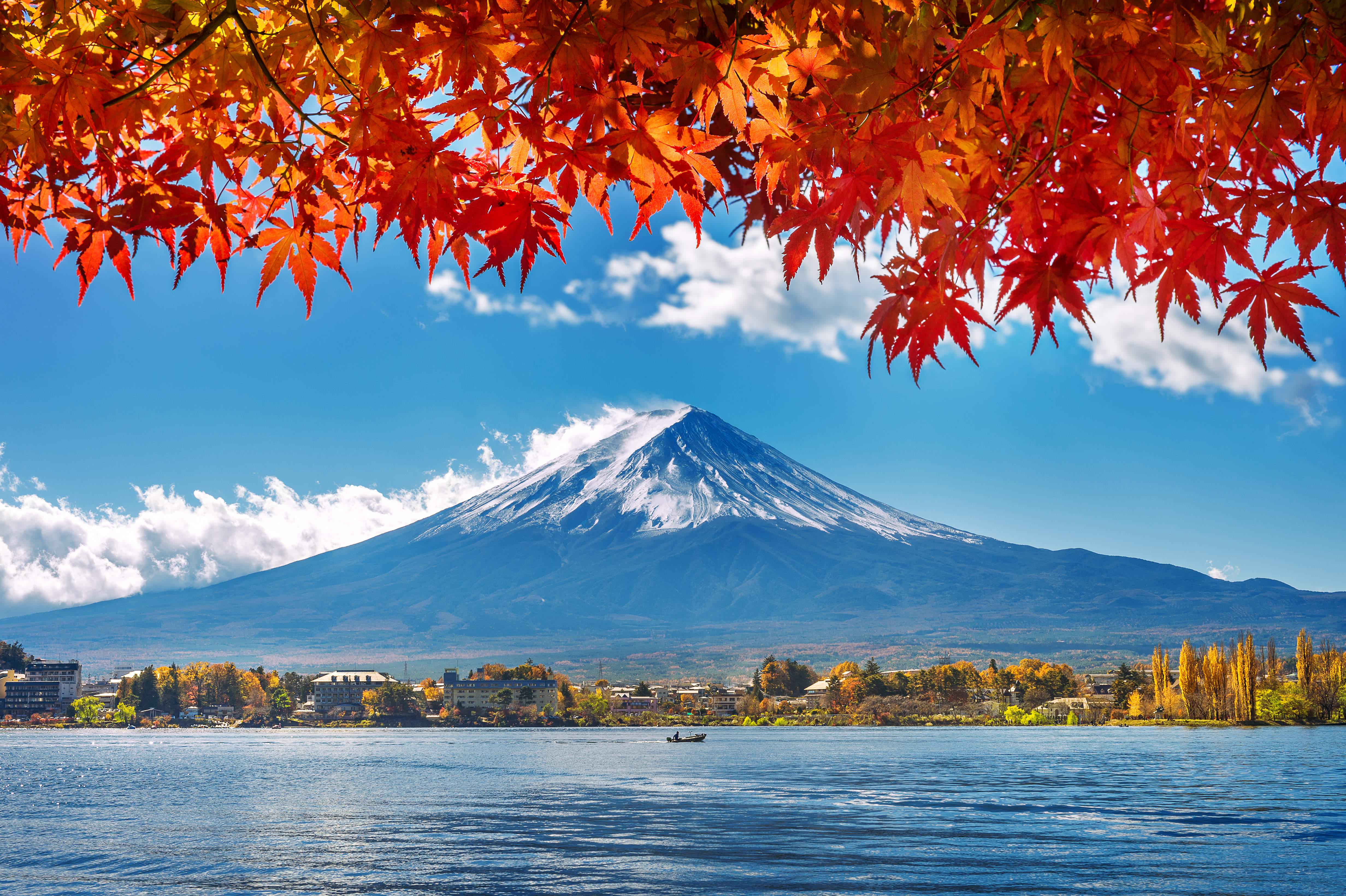 Núi Phú Sĩ: Khi thu về, khung cảnh nơi đây như một bức họa, với lá phong đỏ phản chiếu trên mặt hồ Kawaguchi.