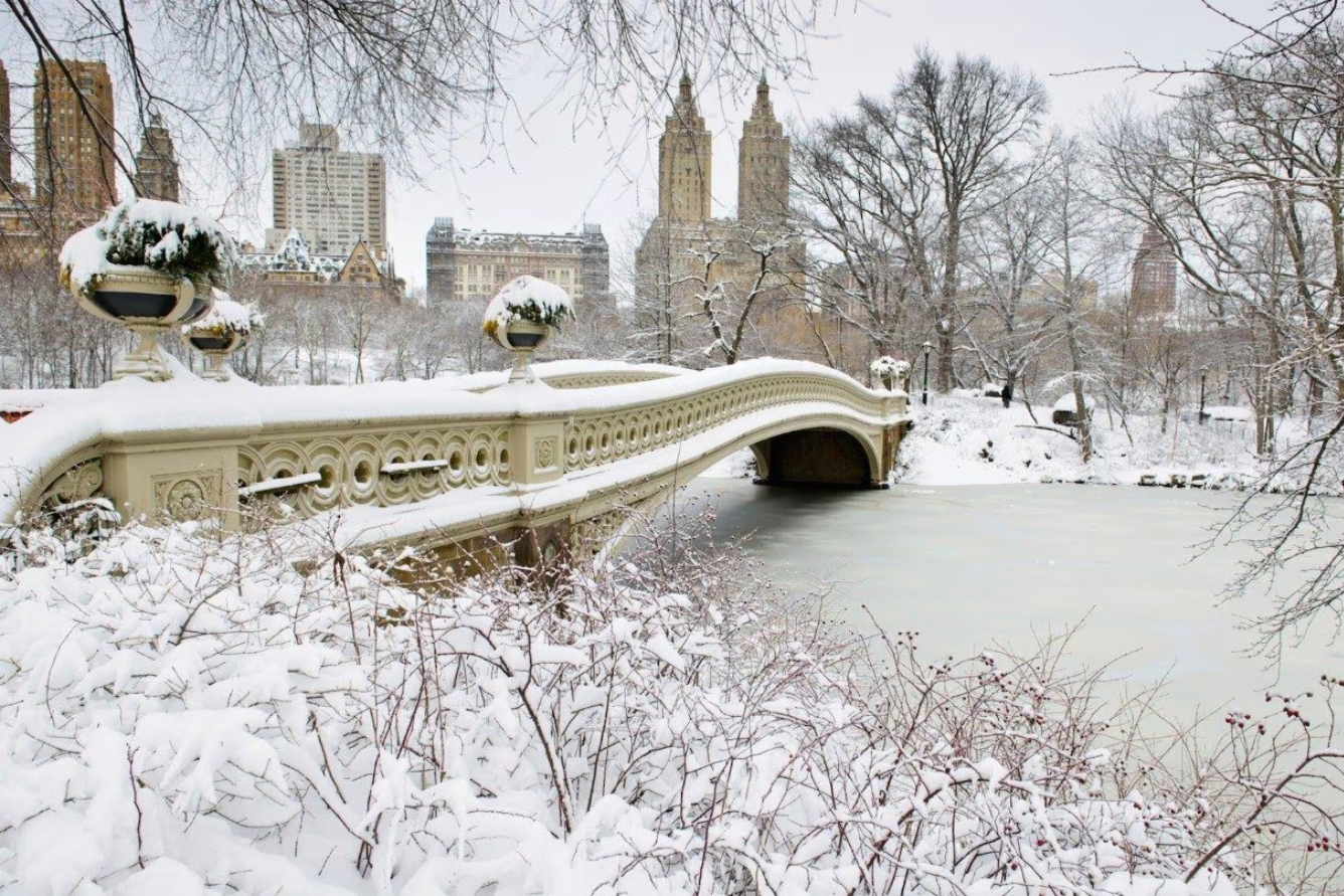 Central Park: Đây là địa điểm ngắm tuyết lý tưởng nhất. Công viên rộng lớn này hoàn toàn biến thành một xứ sở thần tiên. Hãy dạo bước qua cầu Bow Bridge được tuyết phủ, ngắm nhìn những hàng cây trơ trụi nhưng đẹp kỳ vĩ, hoặc nhìn trẻ em chơi nặn người tuyết. Cảm giác ấm áp đối lập với cái lạnh buốt giá khi thưởng thức một ly cà phê nóng bên hồ nước đóng băng là một trải nghiệm không thể quên.