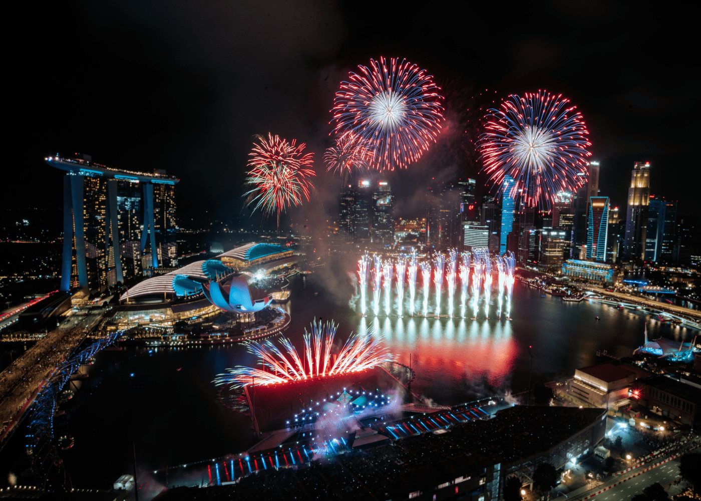Buổi hòa nhạc: Một buổi hòa nhạc lớn thường được tổ chức tại The Float @ Marina Bay (một sân khấu nổi trên vịnh) hoặc khu vực Marina Bay Sands Event Plaza, với sự tham gia của các nghệ sĩ quốc tế và địa phương hàng đầu.