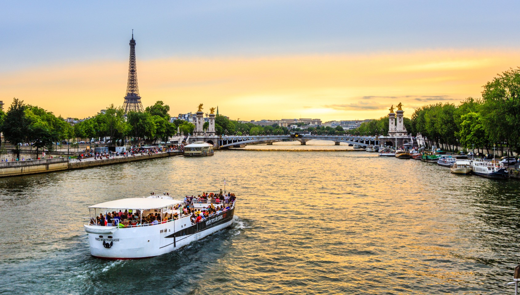 Dạo thuyền trên sông Seine dưới ánh đèn vàng rực rỡ.