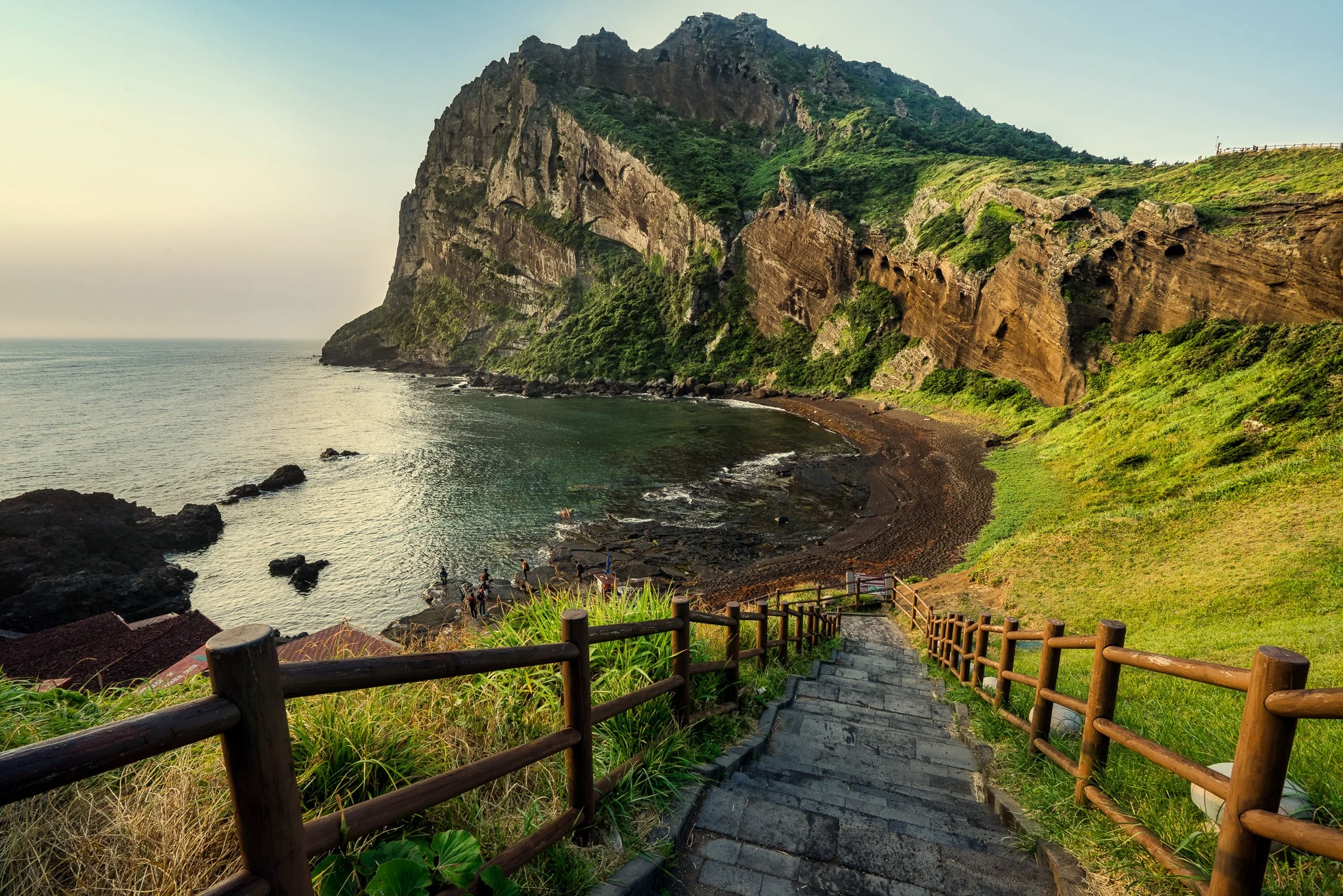 Du khách đến Jeju có thể đón bình minh đầu tiên tại Seongsan Ilchulbong, sau đó tham quan thác nước và những quán cà phê ven biển đặc trưng của đảo.