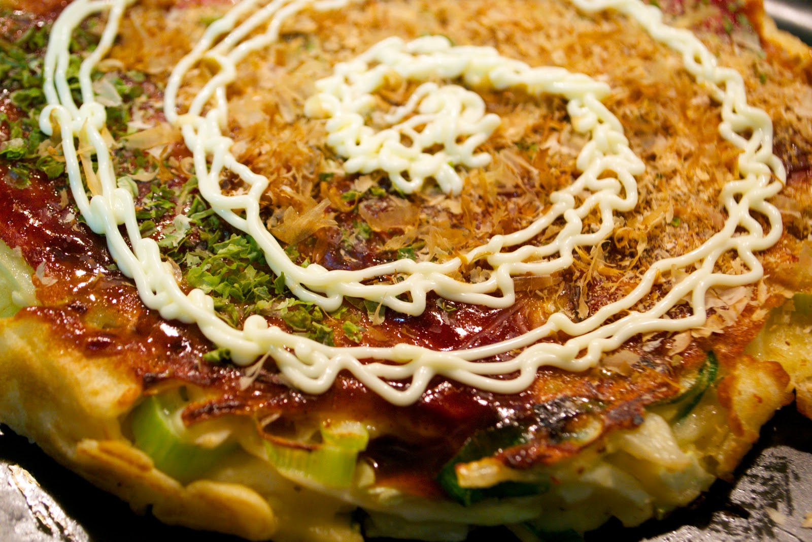 Okonomiyaki: Bánh xèo Nhật Bản với rau, hải sản và thịt, nướng trên bếp ngay tại bàn.